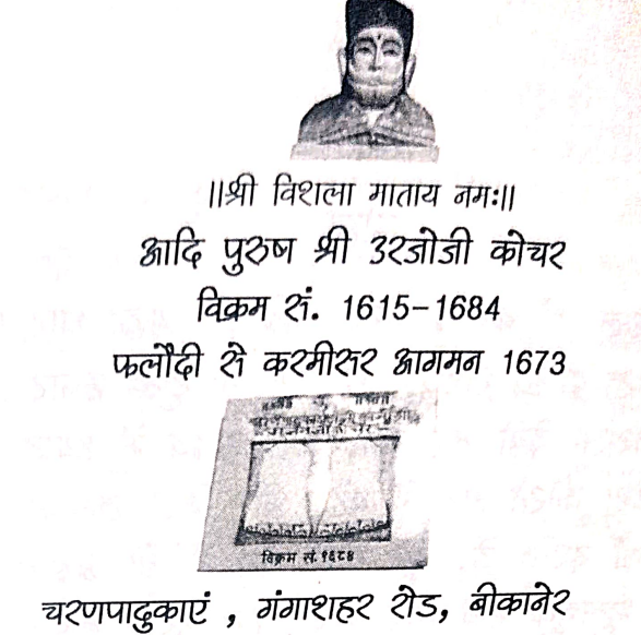 रामदेवजी की 21वीं पीढ़ी में श्री उरझोजी कोचर उत्पन्न हुए, जिन्हें बीकानेर कोचर कुल का आदि पुरुष माना जाता है। उनका जन्म आषाढ़ शुक्ल तीज संवत् 1615 फलौदी में हुआ। उरझोजी जैसे पुत्र रत्न होते हैं जिन्होंने अपनी विनयशीलता, मिलनसारिता, नम्रता, सज्जनता, त्यागशीलता से सबको मुग्ध कर दिया। ऐसा अद्भुत व्यक्तित्व — उत्तुंग शिखर, मारवाड़ी पगड़ी, बलखाती सघन निर्दम मूछें, भव्य मुखाकृति, नयन, मोहक, सघन सूक्ष्म प्राणवान दृष्टि, कर्णरोम, सुंदर स्थूल नासिकाओष्ठ, वृषभस्कंध, भारी शरीर, सामान्य कद, बंदगले का लंबा कोट उस पर पड़ा आवर्तक, श्वेत उत्तरीय राजस्थानी विधि से परिधित धौत वस्त्र — यह बाह्य स्वरूप था उरझोजी का।